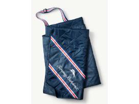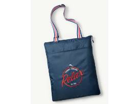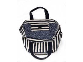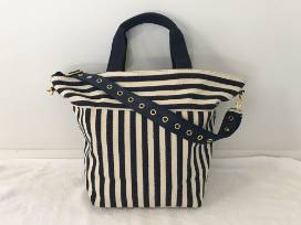 - a Hampton Striped Tote Bag from Equipt4U New York with navy and white stripped canvas and large interior zippered pockets;