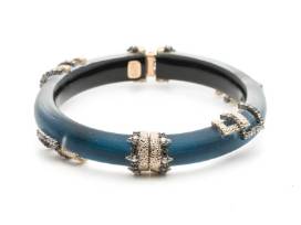 To complete your new look don your Alexis Bittar Brutalist Drop Earrings and Brutalist Studded Skinny Hinge Bracelet, which have been handcrafted in lucite with 10K gold tone plate brass and crystal accents.