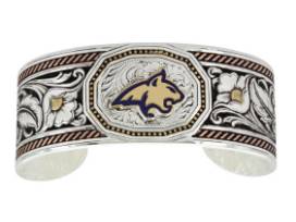 Calling all Montana State University fans! From the LeatherCut Collection, a wide tri-colored cuff bracelet with a precisely hand painted backdrop creates a beautifully vintage looking piece. Rose gold finished edges highlight the twisted rope edge of the bracelet. Hand painted black contrasts and highlights the bright silver floral and leaf Sheridan leather carving pattern accented with gold kissed centers. A center dodecagon with smooth wire and gold tone pinpoint edging is the perfect frame for the gold finished Bobcat head with bright Bobcat blue paint accents. One size fits most.