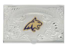 Keep your business cards crisp while showing pride in your school! A bright silver finished slim business card case has classic bright cut engraving flowing around the top lid of the case while a matching ribbon banner has 'Montana State' engraved in it. A large bright gold tone Bobcat head is applied to the middle with lines of Bobcat blue paint accentuate the head's design.