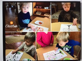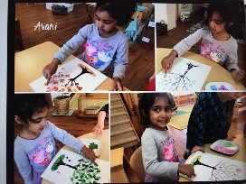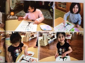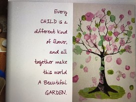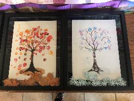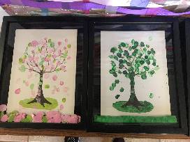 The Seasons: Four trees on canvases represent the four seasons. This project is embellished with the All Day Toddler children's fingerprints and cut outs of leaves, flowers, and grass that form their artwork. This collaborative piece represents the children's growing interest in the passage of time and reflects their understanding of natural change. Priceless! This framed art also includes a photo book about the process.