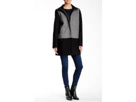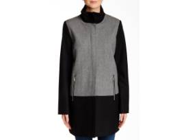 This chic colorblocked wool blend coat features a stand-up collar, topstitch detail, front zip closure, and two front zip pockets. Size M.
