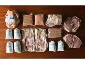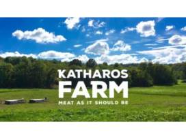 Enjoy this certificate from Katharos Farm which is good for 1lb jowl, 1lb bacon seasoning, 1lb pork sausage, 2 pack chicken quarters, 2 pack wings, 1 whole chicken, 2lbs ground chicken, 2lbs chicken sausage, 3lbs italian sausage, 3lbs brautwurst and a canvas tote.