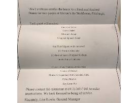 Gift certificate for a one night stay at the Fairmont Hotel in downtown Pittsburgh and a Steak and Seafood Dinner for two at Morton's the Steakhouse.