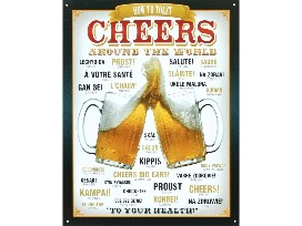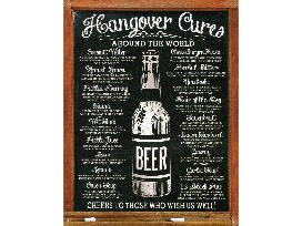 Two (2) tin drinking signs, each measuring 13" x 16". 'Cheers Around the World' & 'Hangover Cures'.