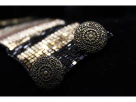Woven glass beads in a stripped pattern with double button closure. Crated by artist Susan Wise. Value $150