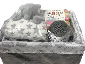 These two adorable baby baskets are filled with goodies to comfort your new addition. They will sleep to soothing sounds with this Conair sound machine and night light, feel snuggled up with this sweet blanket and stuffed animal, and be ready to close their eyes after this bedtime story. With the little one fast asleep, mom will be able to unwind and relax with this Little Moon Mom Survival pack of belly butter, lip balm, Clear Skies Ahead mist, salve, exfoliant and bath salts. Also included is a $25 gift certificate to Lad & Lassie in Wilmette.