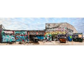 Over 15 years, Prairie Moon in Evanston invited graffiti artists to paint the back wall of their building. It was painted more than 400 times. The building was demolished less than 6 weeks after this print was taken. This mounted color print is 60 inches by 20 inches and captures the vibrancy of the setting.