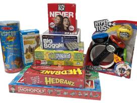 Pick a night. Any night. Make it family game night with this basket of games: Hyper Toss, Suspend Junior, Game Box Never, Big Boggle, Kids Charades, Monopoly, and Hedbanz. You all will have a blast.