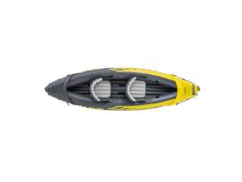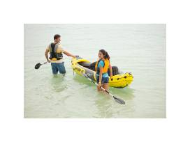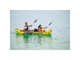 The Intex Explorer K2 Kayak is sporty and fun with a streamlined design for easy paddling. The bright yellow color and sporty graphics makes the kayak highly visible in the water. Great for experiencing lakes and mild rivers with a friend, this Sports Series kayak is perfect for two adults. Lightweight and compact, this kayak is a snap to assemble, and allows you to take the fun of kayaking wherever you go. Made with rugged vinyl construction, this sturdy kayak has an inflatable I-beam floor for comfort and rigidity. A removable skeg provides directional stability, while two adjustable, inflatable seats with backrests are included for comfort. Quick inflating or deflating is a breeze with a Boston valve on each side. A grab line and grab handle at each end is provided for your convenience, as well as a U.S. Coast Guard I.D., and a repair patch kit. The Explorer K2 Kayak provides added accessories including: two 86"aluminum oars and an Intex high-output pump for easy inflation and deflation.