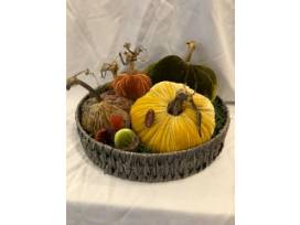 Beautiful plush pumpkins and acorns make up this uniquely designed centerpiece. Add a touch of warmth to your Thanksgiving table with this handcrafted centerpiece.