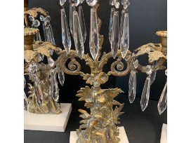 0Three pieces of 19th century neoclassical brass & marble garniture in the form of candlesticks with prisms.