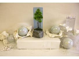 A perfect statement piece for a desk, mantle, windowsill or end table, this fused-glass image of a small deciduous grove in full spring leaf inspires tranquility and contemplation. Artist Katie Patten creates each piece through careful selection of glass and multiple kiln firings--each panel unique in how it captures light and presents its diversity of color. The stone base reminiscent of the earth under the grove.