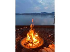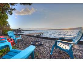 Amenities include a well-equipped kitchen, free wifi, private dock and beach space with fire pit, lake toys and paddle boards.