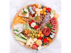9-inch charcuterie tray for 2-4 people from Tray Chic Grazing. Includes meats, cheeses, nuts, fruits, veggies and dip, and sweets. Can be customized for dietary needs.