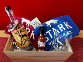 Savor the flavors of Stark Brewing Company and elevate your beverage experience with this enticing basket from Stark Brewing Company. Inside, you'll find a $50 gift card, a 750 ml bottle of Stark Brewing Vodka, Kicking Cloves hot sauce, a branded beer glass, and two Stark Brewing Co. shirts in size medium. But that's not all! Your collection will also boast six Stark Brewing Company 4-packs of beer, featuring an IPA, Double IPA, Belgian Style Wit, 2 Sours, and a Red Ale.