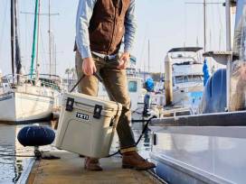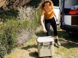 The YETI Roadie 24 Hard Cooler delivers the tried-and-true performance you expect from a YETI. Based on a legendary design, this Roadie is 10% lighter, holds 20% more, and performs 30% better thermally than the previous model. Rotomolded Rocksolid™ construction delivers incredible toughness, while the Permafrost™ insulation, Interlock™ lid system, and freezer-quality Coldlock™ gasket keep ice for days. Neverfail™ hinge system uses an interlocking design that won't snap or break, while the flexible Quicklatch™ latches make getting in the cooler a breeze. A Heftyhauler™ handle and Lipgrip handles make transport simple, plus the YETI Roadie 24 Hard Cooler boasts a tall design that's perfect for fitting a bottle of wine or 2L soda bottle upright inside. Finished with Bearfoot nonslip feet and Anchorpoint™ tie-down slots to keep it from sliding around. This YETI cooler holds up to 33 cans or 26 lbs. of ice.