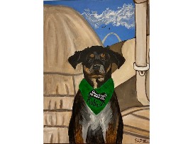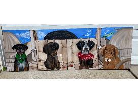 I added a muddy tire tread mark around each pups edging. Each tread pattern is different. I think this really adds some personality to them. As for the sky background one might think they are down at the riverfront for the 4th of July. Since this was finished in July I thought it fitting. So I added a skywriting plane, a banner towing plane, and the Arch. These pieces can be purchased and displayed individually, or all four together making a full jeep full of puppies. Another option is to display the two center pups which are in the back seat and the two end pups in the front. So many options for potential bidders!