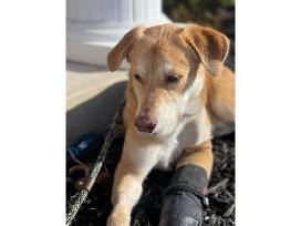 Russ was transferred to us for medical reasons. He has a broken pelvis and will need surgery to fix it. Poor Russ is paralyzed in his front leg as well. He will also need that leg amputated. He is the sweetest boy and has been a trooper through this journey. We cannot wait to see what his future holds.