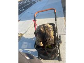 Kennedy was found on the streets of St. Louis. She could not use her back legs. Kennedy captured the staff and volunteers' hearts quickly as she is very sweet and loving. She has a heart of gold. Kennedy does use a wheelchair to get around. She loves other dogs and has never met a stranger. Kennedy made her way to the Asher House and is doing great!