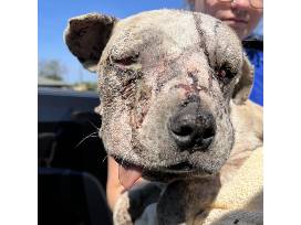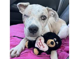 Jessie is a beautiful girl that came to us severely injured. She spent many days at the emergency clinic. Her face was severally swollen and infected, required a feeding tube to be placed. She has undergone many surgeries including reconstructive surgery. She touched the hearts of so many and was so easy to love. Jessie ended up being adopted by one of her emergency vet techs. She lives the best life and is treated like a princess every day.