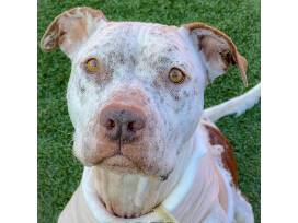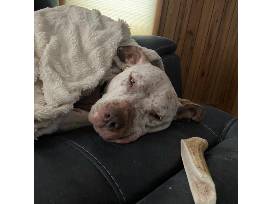 This is Picket the pitty! She's the sweetest little mama there ever was. She's was under weight, but is now happy and healthy. Her underarm had stitches from being caught in barbed wire. She's seriously the perfect all around dog. She's a quiet girl, a couch potato, down for a walk, and likes to be around and socialize with other dogs. She's PERFECT with kids. Picket will let you pull her ears, tail, touch her mouth.. do all the things and she doesn't flinch. She's perfect for little kids who want to love and climb all over her. Overall, she is a no flaw dog.