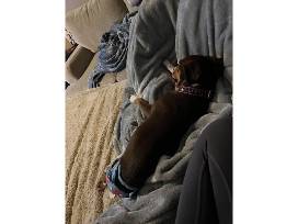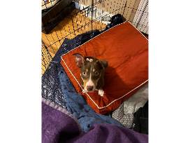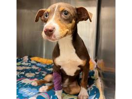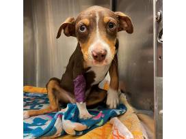 Ramone came to us after being hit by a car. Her back is broken and she has open wounds. She is such a sweet soul and has a long road to recovery. She was only 3 months old and had a long road to recovery. Ramone was recently cleared and went to a loving foster home! In her foster home, she has another dog in the house in a wheel chair. She is thriving and living her best life.