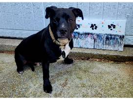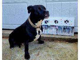 Co-Artist was SR Alum, Dante (pictured with the piece)! We want to recognize him for the beautiful paw prints he contributed to the piece.