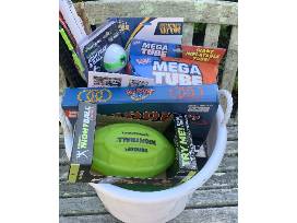 Enjoy this fun basket of toys from RVYay Toys. Located in the heart of RVA at the Shops at 5807, this basket includes a LED Football, Flippin' Rings, a Mega Tube, a Night Bat & Ball, a Retractable Tennis Table and Bow and Arrow Set.