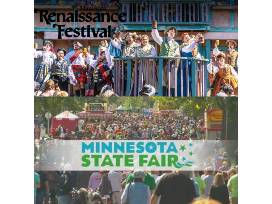 Two (2) vouchers for Outside Gate admission to the 2024 MN Fair. Valid for one day Aug 22- Sept 2, 2024. Two (2) Vouchers for admission to the 2024 MN Renaissance Festival valid the first 4 weekends of the Festival August 17th - September 8th plus Festival Friday, September 27th. Dates valid: August 17-18,24-25,31. September 1-2,7-8,27.