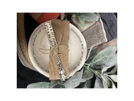 Mudpie hummus bowl and knife, wooden house decor, towels, artificial plant, and cloth basket