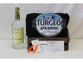 This unique package includes your very own bottle of Wendt's on the Lake Vodka, a $20 gift card to Wendt's, a cozy sturgeon spearing sweatshirt size XL, and funky orange sturgeon earrings.