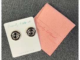 The jeweler takes luxury brand buttons and zipper pulls to repurpose the items into beautiful, classic, and unique jewelry pieces at accessible prices. Each up-cycled piece is handmade. These Gigi earrings are Gucci authentic buttons 22 mm wide and perfect for a fun pair of casual earrings.