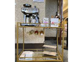 Comes with a 2 tier bar cart, Bottle of Bourbon Cream and Hazelnut Liqueur, Flavored syrups and espresso cups
