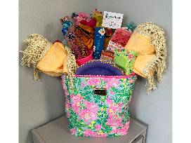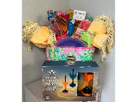 Lilly Pulitzer Summer Winds Cooler Bag reusable cups and plates, Pinapple Candle, Napkins, Rose Sangria, Cocktail Mixer, Flower Ice Cube Tray, Sunscreen, Lawn Darts Cooler, Beach Towels.