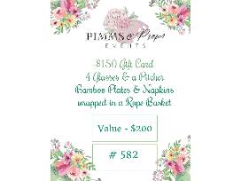 $150 Gift Card, 4 glasses & a pitcher, Bamboo plates & napkins, wrapped in a rope basket