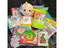 Cocomelon: Umbrella, stuffed animal, plush throw blanket, 3 piece feeding set, LED mood light, toy remote, Number and counting activity book, dry erase notebook set, imagine ink book, LED flashlight, play and pack set, Peeps, Chocolate bunny and 4 lanyards
