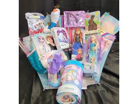Frozen: Umbrella, Anna Barbie, Elsa Barbie, Olaf stuffed animal, lunchbag, fleece throw, folders, coloring book, puzzle, Imagineink, bubbles, Little People Anna, Peeps and Chocolate bunny