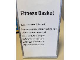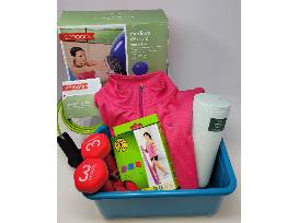Container filled with Jacket, fitness ball, hand weights, jump rope, stretch bands and drink container.