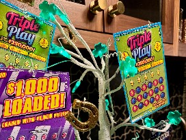 A festive light up St. Patrick's Day tree decorated with $100 worth of scratchers in a reusable pot. At the base of the pot are two St. Patrick Day gnomes snuggling up with three mini bottles of Jameson's and two Baileys.