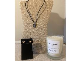 Handcrafted Butterfly studs paired with a custom Blue Kyanite necklace/bracelet brings freedom and stability. Enjoy your beauty with a top-of-the-line Voyage et Cie candle exclusive from Tootie's of Houston and you will be flying high.