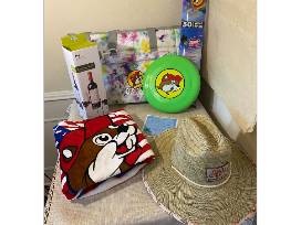 Soft sided cooler, kite, wine stand and glasses, 2 Buc-cee's' towels, frisbee and sun hat. Also included are healthy beach tips from Lone Star Chiropractic to help protect you and Buc-cee!
