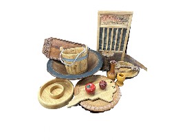 Items include but not limited too: wooden tray, North Carolina shaped cutting board, 2 wooden apples, 3 bowls, 3 candle holders, 1 vase, 1 lazy Susan, washboard, wooden bucket