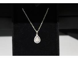 The necklace features a pear-shaped composite of round-cut diamonds wrapped in a teardrop halo of round diamonds