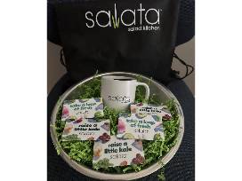 $125 of Salata Gift Cards, tshirt, coffee mug, and salad bowl.