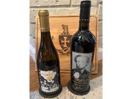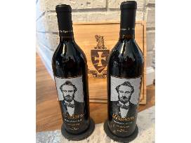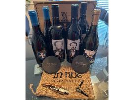 In Hoc Vino Crate with red wine wine selection. Six (6) bottles. Wisdom - Thomas Cowan Bell (x2), Norman Shield (x2), The Sweetheart, Integrity - William Lewis Lockwood, In Hoc Napa Valley Coasters, and collectible In Hoc cork screw.