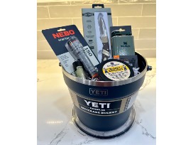 Yeti beverage bucket, Duke cannon products, Stanley flask, Old Timer pocket knife, and Nebo Newton flashlight.