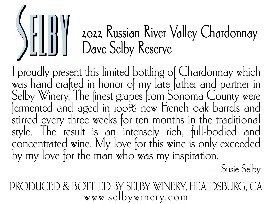 Dave Selby Reserve Chardonnay is only produced when everything about the vintage and the vineyard are flawless. The grapes were picked at ideal levels of acidity and flavor, then the free run juice was put into Selby's finest new French barrels. Gentle stirring for 15 months and hand bottling complete the process.