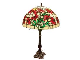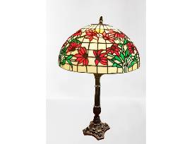 The Tiffany-style handmade lamp is a stunning fusion of intricate craftsmanship and timeless elegance. Its colorful stained glass panels and detailed metalwork emit a warm and inviting glow when illuminated, making it a perfect choice for adding sophistication to any room. With its exquisite russet poinsettia flowers, bay green leaves, and beige background on the Tiffany Studio reproduction stained glass shade, this lamp is a captivating centerpiece in any home. Crafted using Tiffany's foil-wrapped construction method, this handmade lamp is a true masterpiece of artistry and design.