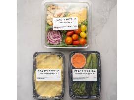 This Feast & Fettle gift basket includes a gift card for 1 week of meals, set of salad spoons, insulated tumbler, silicone lunch box, and pot holder.